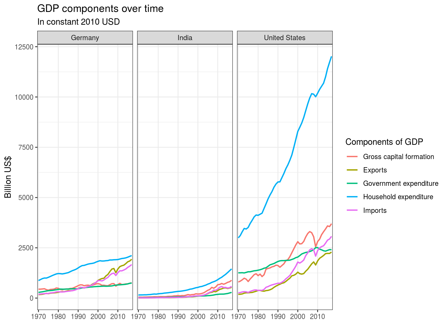 We also observe an interesting relationship between household expenditures, net exports, and gross capital formation across given countries. Each country has its own story. India experienced significant GDP growth starting from 2000 onward, which was fueled by acquisition of assets increasing overall production output, which is shown on the graph by gross capital formation. Having seen the graph we can state that consumption level decreased (household expenditure) in favour of future investments. Furthermore, India experienced a trade deficit (negative net exports) which might be explained by its acquisition of foreign technologies, which ultimately contributed to GDP growth. On the other hand, German GDP growth at the beginning of the 2000’s was driven by export, which is reflected in the increase of net exports (trade surplus). Notably, the United States are one of the key recipients of German goods, which explains the US trade deficit that can be observed on the graph above (US negative net exports). Most US-imported goods are consumables, thus we can observe a slight increase in US household expenditure over the given period.